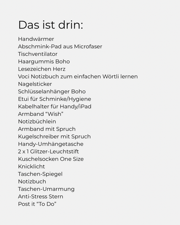 • coole Artikel (siehe Verpackungsliste)